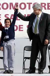 L� Obrador felicita a uno de los alumnos promotores de la salud escolar que recibieron reconocimiento ayer en el Z�o capitalino FOTO Francisco Olvera