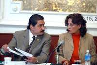 El presidente de la Comisi�e Administraci��a Local, Alberto Trejo Villafuerte, y la delegada de Tl�ac, F�ma Mena, durante la comparecencia de la funcionaria en el sal�uis Donaldo Colosio de la Asamblea Legislativa FOTO Guillermo Sologuren