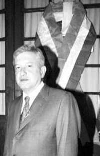 El jefe de Gobierno, Andr�Manuel L� Obrador, durante su conferencia de este viernes. Al fondo se observa un list�ricolor en contra del juicio de desafuero que se sigue al mandatario capitalino FOTO Francisco Olvera