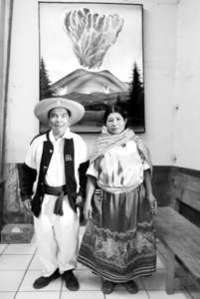 Fidel Dur�Pulido y su esposa Nicolasa Isidro Ch�z, purepechas originarios de San Juan Viejo, pueblo que qued�pultado bajo la lava, posan bajo una pintura del volc�en la oficina de la tenencia de la tierra en Caltzontzin, Michoac�FOTO Jos�arlo Gonz�z