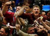 Operadores del mercado de cambios de Nueva York en la sesi�e ayer martes, cuando los precios del petr� llegaron a m�mos de 15 semanas, al subir casi 3 d�es, por encima de los 51 d�es el barril, mientras una ola tard�de fr�manten�en alza la demanda de combustible para calefacci�n Estados Unidos y Europa. El crudo liviano estadunidense subi�80 d�es o 5.8 por ciento, a 51.15 d�es el barril FOTO Reuters