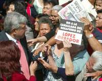 Antes, otra menor aprovechó el descuido de una maestra para correr y entregarle un sobre hecho con papel cuadriculado, y aunque no había carta en su interior, con lápices de colores escribió: "Que lo bendiga Dios. No al desafuero. No se deje. De: Rosalinda. Para: López Obrador".
