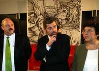 El rector de la UNAM, Juan Ram�e la Fuente, acompa� por el titular de la SEP, Reyes Tamez, y la secretaria de Cultura del DF, Raquel Sosa, anoche en el Palacio de Miner�FOTO Francisco Olvera