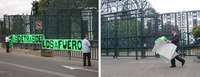 Dos grupos perredistas se sincronizaron para desplegar un mo�n Los Pinos contra el desafuero y cartulinas en un acceso; a la derecha, personal de la residencia oficial despega los mensajes FOTOS La Jornada