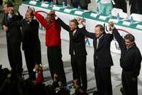 Enrique Jackson Ram�z, Enrique Mart�z y Mart�z, Arturo Montiel Rojas, Roberto Madrazo Pintado, Manuel Angel N�Soto y Tom�Yarrington Ruvalcaba en la clausura de la 19 asamblea nacional del PRI, ayer en Puebla FOTO Jos�arlo Gonz�z