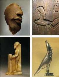 (arriba a la izquierda)Fragmento facial de Akhenat�a la derecha, Relieve de templo: Rams�II presenta una ofrenda y, abajo a la izquierda, estatuilla de Akhenat�, a la derecha, estatua del Dios-halc�on algunas de las m�de 150 obras incluidas en la exposici�ara�el culto al sol en el antiguo Egipto, que se abrir�n el recinto de Paseo de la Reforma y Gandhi, Bosque de Chapultepec FOTO Cortes�Inah