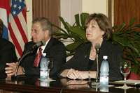 Kathleen Blanco, gobernadora de Louisiana, ayer en La Habana durante un viaje de negocios en la isla, a su lado, Pedro Alvarez, director de la importadora de alimentos de Cuba FOTO Ap
