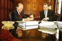 El novelista Carlos Fuentes y el coordinador pri�a en el Senado, Enrique Jackson Ram�z FOTO Jes�llaseca