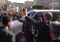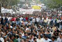 Guadalajara, Jal., 10 de marzo. En gira de trabajo en esta ciudad, el presidente Vicente Fox recibió, de forma simultánea, la voz del elogio que desde la filantropía lo llamó "extraordinario líder", y los gritos de un centenar de perredistas que desde la Plaza Laureles lanzaban consignas contra el desafuero del jefe de Gobierno del Distrito Federal, Andrés Manuel López Obrador, que llegaban claros y persistentes al patio central del palacio municipal tapatío, donde el mandatario comía con unas 200 personas.