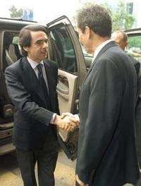 Jos�ar�Aznar, ex presidente de gobierno espa� saluda al rector del Tecnol�o de Monterrey, a su llegada a esa instituci�ducativa, en la capital de Nuevo Le�donde imparti�a conferencia FOTO Notimex