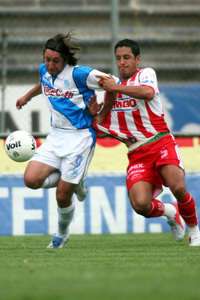 Pese al jal�Ignacio Quinteros, del Puebla (izquierda), gana el esf�co al rayo Juan Mendoza FOTO Ap