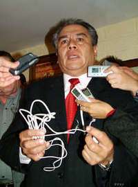 Carlos Alvarado muestra a los reporteros un micr�o que encontr� oficinas del PRI FOTO Alfredo Valad�