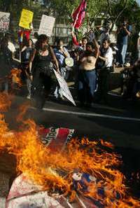 Aspecto de la marcha efectuada ayer, frente a la embajada de Estados Unidos, donde las manifestantes quemaron una bandera de ese pa�FOTO Francisco Olvera