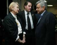 La viuda de Samuel del Villar, Enriqueta Loaeza, recibe las condolencias de Andr�Manuel L� Obrador, quien destac�e las aportaciones del ex procurador capitalino a la democracia fueron muy importantes por su integridad y rectitud FOTO Mar�Mel�rez Parada