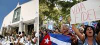 Las damas de blanco, esposas de presos disidentes, en la iglesia de Santa Rita, donde acuden cada semana desde que ocurrieron las aprehensiones. A la derecha, simpatizantes de Fidel Castro en La Habana FOTOS AP y Reuters
