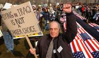 Walter Ducharmarme, de Cambridge, Massachusetts, alza una pancarta con la leyenda "morir en Irak no es elecci�rofesional", durante la manifestaci�ue se efectu�er en Boston para conmemorar el segundo aniversario de la invasi�e Irak FOTO Ap