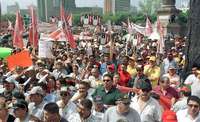 Miles de personas afiliadas a centrales obreras, partidos y organismos ciudadanos durante el plant�yer en la explanada de Los H�es, frente al palacio de gobierno, en Monterrey FOTO Notimex