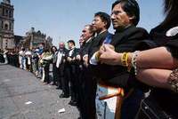 Vestidos en su gran mayoría de negro, con los codos pegados a las costillas y las muñecas cruzadas sobre el pecho, aferrando a izquierda y derecha las manos de sus vecinos, centenares de ilustres y poderosos hermanos (y también ilustres y no menos poderosas hermanas) que pertenecen a las grandes logias y supremos consejos de nuestro país, formaron ayer en punto de las 14 horas, y teniendo como centro la bandera monumental del Zócalo, un "círculo de unión" para expresar el repudio de la masonería mexicana al inminente desafuero de Andrés Manuel López Obrador.