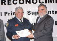 El primer superintendente Alejandro Aguilar L�, director general del cuerpo de Bomberos de la ciudad de M�co, recibe un reconocimiento del secretario de Gobierno, Alejandro Encinas, por 50 a�de labores en la corporaci�FOTO GDF