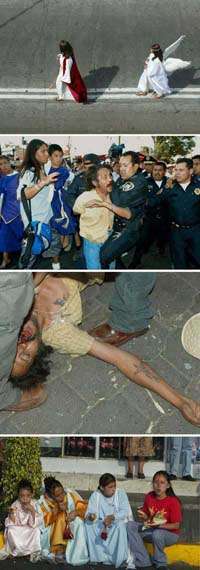 Arriba, Jes�s emprende, custodiado por un angel, el camino que lo habr� de llevar a su muerte y posterior resurrecci�n. Sin embargo, en esta ocasi�n tambi�n a los fariseos les toc� sufrir, pues este hombre (fotos centrales), en estado de ebriedad, los atac� con un pu�al para salvar a Jesusito, situaci�n que fue controlada por elementos policiacos. Abajo, tras la Visita de las Siete Casas, es momento de descansar y recobrar las fuerzas perdidas FOTOS Guillermo Sologuren y Fernando Castillo / Micphotopress