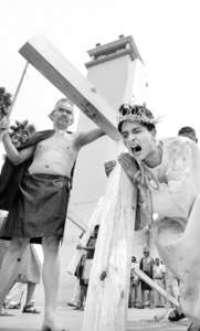 Minutos antes, el personaje de Jesús ya había sido arrastrado por el escenario para que soldados, menos fornidos que el centurión, le propinaran una serie de puntapiés.