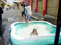Vecinos del barrio de Tepito, en la ciudad de M�co, sacan a la calle una peque�iscina inflable para celebrar el S�do de Gloria. Sensibilizados por la situaci�e escasez que viven habitantes de varias delegaciones, los capitalinos prefirieron visitar los balnearios de la ciudad para refrescarse en este d� La SSP report� personas detenidas por desperdiciar el agua FOTO Notimex