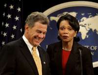 La secretaria de Estado estadunidense Condoleezza Rice, y Michael G. Kozak, secretario adjunto para Democracia, Derechos Humanos y Trabajo, en la presentaci�el informe sobre las garant� individuales en 101 pa�s, ayer en Washington FOTO Ap