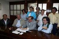 A la izquierda, Jorge Mart�z, gerente general de La Jornada, y Ricardo Garc�Sainz, presidente del consejo de administraci�e Demos. A la derecha, Juan Antonio Z�, secretario general del Sitrajor, durante la firma del acuerdo sobre la revisi�el contrato colectivo de trabajo en la Junta Local de Conciliaci� Arbitraje FOTO Jos�ntonio L�