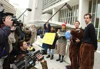 Miembros de una organizaci�ocial ofrecen una conferencia de prensa frente a la sede del Banco Mundial, donde protestaron por la designaci�e Paul Wolfowitz como presidente del organismo FOTO AFP