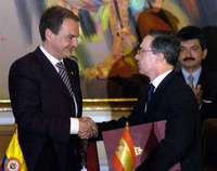 Alvaro Uribe felicita a Jos�uis Rodr�ez Zapatero luego de la firma de acuerdos bilaterales FOTO Ap
