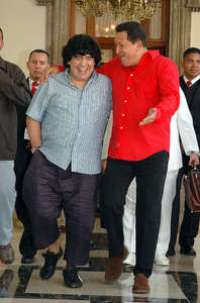 El Pelusa asistió el martes pasado a Puerto Ordaz (sur de Venezuela) a una cumbre que sostuvieron Chávez; el jefe del gobierno español, José Luis Rodríguez Zapatero; el presidente de Colombia, Alvaro Uribe, y el de Brasil, Luiz Inacio Lula da Silva, e intercambió palabras con los mandatarios.