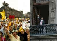 El jefe de Gobierno del Distrito Federal, Andr�Manuel L� Obrador (recuadro), saluda a los cientos de simpatizantes que se congregaron en el Z�o despu�de conocer el sentido del dictamen sobre el proceso de desafuero FOTO Jos�ntonio L�