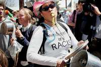 Una activista en favor de los derechos de los migrantes se manifiesta en Tombstone, Arizona, contra el intento de Minuteman Project para detener a indocumentados FOTO AFP