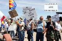 Integrantes de la organización Minuteman Project, considerada racista por grupos defensores de migrantes, realizaron manifestaciones de protesta simultáneas frente a estaciones de la Patrulla Fronteriza de Estados Unidos en Naco y Douglas, Arizona, en demanda de una mayor vigilancia que permita frenar la "invasión" de indocumentados a su país.