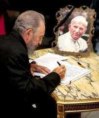 El presidente cubano Fidel Castro firma el libro de condolencias por la muerte de Juan Pablo II en la Nunciatura Apost�a en la Habana FOTO Reuters