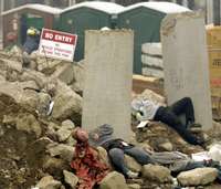 Dos personas interpretan el papel de heridos durante las primeras maniobras del ejercicio Topoff 3 en New London, Connecticut, con el que el gobierno de Estados Unidos pretende medir la capacidad de respuesta de sus �nos de seguridad ante la eventualidad de un ataque terrorista FOTO Reuters
