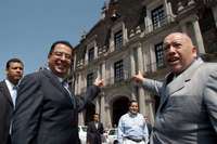 A�s adversarios, ex pri�as los dos, Rub�Mendoza Ayala, candidato del PAN a la gubernatura del estado de M�co, e Isidro Pastor, ex dirigente del tricolor en la entidad, durante el acto en el que dieron a conocer ayer la incorporaci�el segundo al equipo de campa�anista FOTO Agencia MVT/Mario V�uez de la Torre