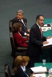 En primer plano, el subprocurador Carlos Vega Memije, durante su exposici�e ayer en San L�ro. Atr� Mar�Teresa Ju�z de Castillo y Andr�Manuel L� Obrador FOTO Jos�ntonio L�
