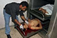 En el campamento de refugiados de Rafah, un m�co forense revisa uno de los cad�res de los tres j�es que fueron ultimados FOTO AP