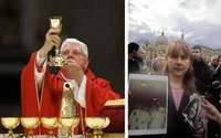 El cardenal estadunidense Bernard Law en la misa por el Papa Juan Pablo II en la bas�ca de Santa Mar�ayer en el Vaticano. A la derecha, Barbara Blaine, representante de una red de fieles abusados sexualmente por sacerdotes cat�os, protesta contra el jerarca religioso FOTO AP y AFP