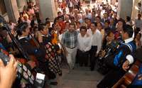 Los rectores Juan Ram�e la Fuente y Francisco Mart�z Neri, de la UNAM y de la UABJO, junto con el gobernador Ulises Ruiz, escuchan a la estudiantina de la universidad oaxaque�OTO Notimex