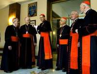 Los cardenales Justin Rigali, Adam Joseph Maida, Roger Michael Mahoni, Francis Eugene George, William Henry Keeler y Theodore Edgar McCarrick, en el Vaticano, la v�era del inicio del c�ave para elegir nuevo Papa FOTO Ap