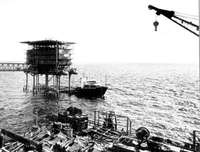 Trabajos de mantenimiento en la plataforma AKAL-J; alrededor, barcos de apoyo log�ico FOTO Tomada del libro Los cohetes duraron todo el d� de Pedro Meyer