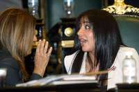 Las legisladoras locales Mar�Rojo y Alejandra Barrales intercambian puntos de vista durante la comparecencia del secretario de Seguridad P�a del Distrito Federal, Joel Ortega Cuevas FOTO Guillermo Sologuren
