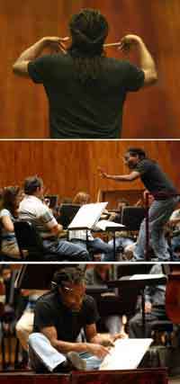 Parte del tiempo se la pasa interpretando en voz baja la obra en turno, primero la Sinfonía clásica y luego, en la segunda parte de la sesión, Un americano en París. A ellas se sumarán en el concierto las obras de Ravel: La Tombeau de Couperín y Bolero.