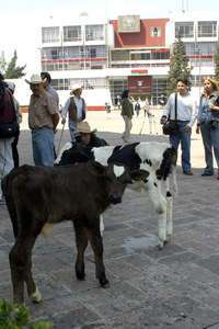 Pachuca, Hgo., 21 de abril. Productores de leche de la entidad se manifestaron ante el palacio de gobierno, frente a cuya entrada colocaron dos vaquillas, y anunciaron que protestarán en el Zócalo de la ciudad de México -donde regalarán más de 10 mil litros de leche- para exigir al gobierno federal que frene la competencia desleal que les representan vendedores del alimento, pero no natural como el de ellos, sino elaborado con base en lactosueros.