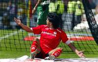 El paraguayo Jos�aturnino Cardozo abri� marcador al minuto 27 tras cometer falta sobre el santista Carlos Rosales FOTO Afp