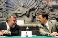 Alejandro Encinas y Marcelo Ebrard, secretarios de Gobierno y de Desarrollo Social, respectivamente, durante la tercera entrega en el a�e cheques del programa para el rescate de unidades habitacionales. Entre ambos qued� lugar vac� con la foto del mandatario capitalino, Andr�Manuel L� Obrador, sobre la mesa. El acto se llev�cabo ayer en el Museo de la Ciudad de M�co FOTO Yazmin Ortega Cort�