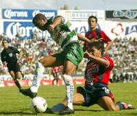 Manuel L� Mondrag�del Veracruz (derecha) intenta a toda costa frenar la escapada del santista Julio C�r Machado FOTO Ap