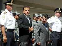 En la imagen, el almirante Gerardo del Barrio, director de las fuerzas federales preventivas; Miguel Angel Yunes, subsecretario de Seguridad; Ram�art�Huerta, titular de la SSP federal, y el almirante Tom�Valencia Angeles, durante la toma de protesta del personal que reforzar�a vigilancia en las prisiones federales FOTO Mar�Luisa Severiano